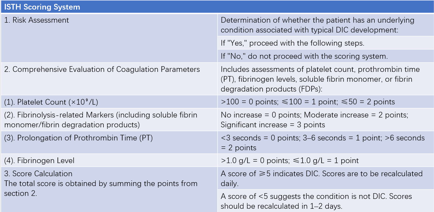 DIC has a complex and variable clinical presentation, and no single laboratory parameter offers both high sensitivity and high specificity. Diagnosing DIC poses significant challenges in clinical practice. In 2001, the DIC Subcommittee of the International Society on Thrombosis and Haemostasis (ISTH) proposed a scoring system to diagnose overt DIC.