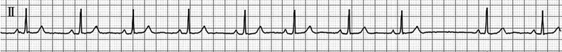 In lead II, the sinus PP interval gradually shortens until a long PP interval appears. The long PP interval (1.47 seconds) is shorter than twice the basic PP interval (0.95 seconds).