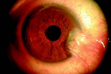 A yellowish nodular growth extending from the nasal side towards the cornea.