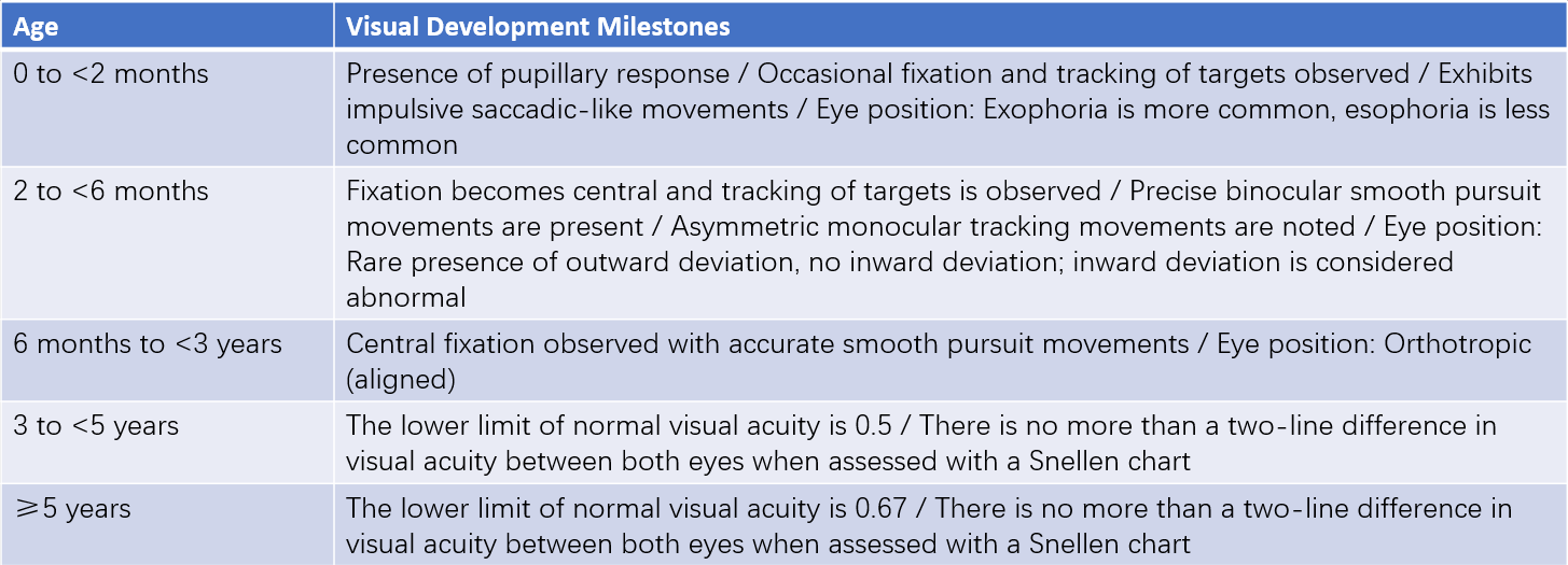 Amblyopia is a developmental visual disorder, making an understanding of visual development crucial for its diagnosis, treatment, and prevention. Visual acuity in children develops progressively. The critical period for visual development is from birth to 3 years of age, with a sensitive period extending to 12 years. Binocular vision development is typically complete by the age of 6–8 years. Milestones in visual development at different stages highlight the need to consider age as a factor when diagnosing amblyopia.