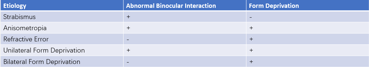 The mechanisms underlying amblyopia are complex. Two widely accepted theories explain its development: abnormal binocular interaction and form deprivation.