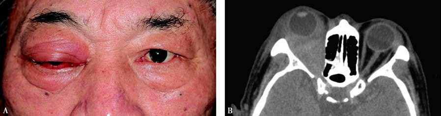 This form involves widespread infiltration of the soft tissue structures in the orbit. Common symptoms include proptosis, periocular swelling, increased orbital pressure, lacrimal gland enlargement, extraocular muscle thickening, and even optic nerve thickening. CT scans demonstrate diffuse soft-tissue changes in the orbit, including involvement of the lacrimal gland, extraocular muscles, and indistinct lesion margins with generally homogeneous density.