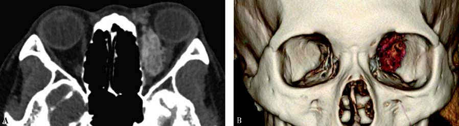 A. Contrast-enhanced CT image showing a poorly defined lesion with mixed density in the left orbit.