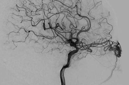 The feeding artery, vascular nidus, and draining vein are clearly visualized on angiography.