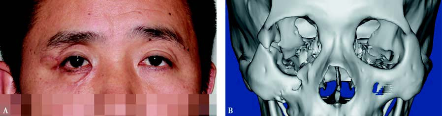 A: Patient’s facial appearance. B: CT 3D reconstruction of the orbit.