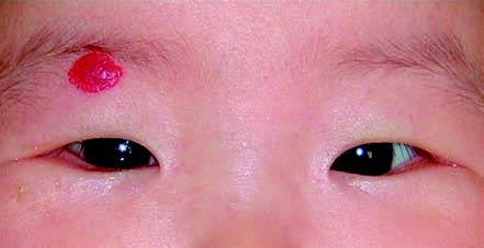 Superficial hemangiomas of the eyelid appear bright red in color. Subcutaneous hemangiomas of the eyelid are sometimes connected to orbital hemangiomas, exhibiting a bluish or purplish hue. Such lesions may exert pressure on the eye, leading to astigmatism, anisometropia, strabismus, or amblyopia. Eyelid hemangioma should be distinguished from port-wine stain (PWS), which is a congenital anomaly composed of dilated sinusoidal vessels. Unlike hemangiomas, port-wine stains are flat, progress slowly, and in some cases, are associated with Sturge-Weber syndrome.