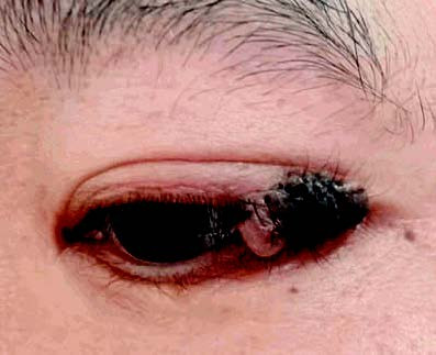 A pigmented nevus of the eyelid is a congenital flat or elevated lesion composed of nevus cells, with well-defined margins. Pigmentation may be present from childhood or may not appear until puberty or adulthood. Histologically, pigmented nevi can be classified into the following types: