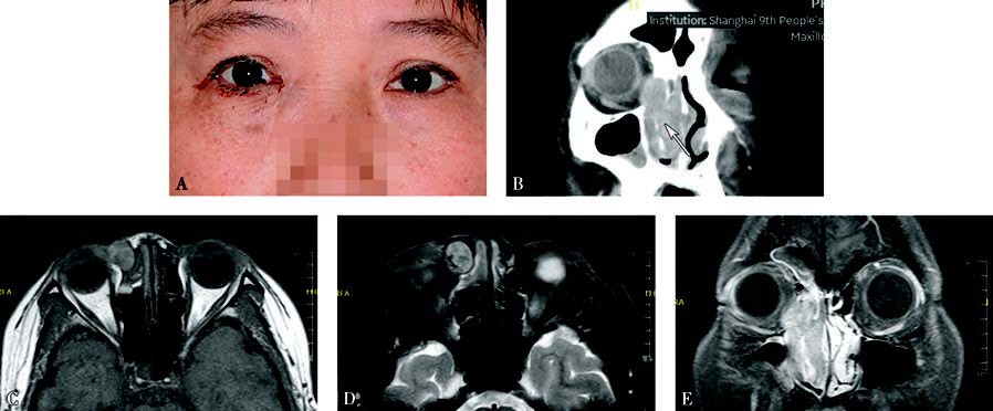 The disease is more prevalent in middle-aged and elderly individuals, with no significant gender difference. In the early stages, common symptoms include epiphora and mucopurulent discharge, which are often misdiagnosed as chronic dacryocystitis. As the condition progresses, symptoms such as bloody tears, pain, epistaxis, proptosis, or systemic manifestations may develop. A firm, poorly tender mass in the medial canthal region typically becomes palpable in most patients about six months after the onset of epiphora. The tumor exhibits highly invasive behavior, with a tendency to infiltrate the paranasal sinuses and orbit and to metastasize systemically. CT imaging reveals an irregular mass in the lacrimal sac region with destruction of the medial orbital wall and the bony structure of the nasolacrimal duct, accompanied by invasion into the ethmoid sinus or nasal cavity. MRI findings show the tumor as exhibiting intermediate to high signals on T1-weighted images and intermediate to low signals on T2-weighted images, with inhomogeneous enhancement after contrast administration. Pathological examination commonly identifies epithelioid cell types, characterized by eosinophilic cytoplasm, round nuclei with prominent nucleoli, and the presence of melanin granules in the cytoplasm.