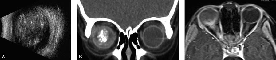Ocular ultrasound may reveal echogenic masses of variable intensity in the vitreous cavity. Calcifications, reflected as highly echogenic shadowing, are present in 60% to 80% of cases.
