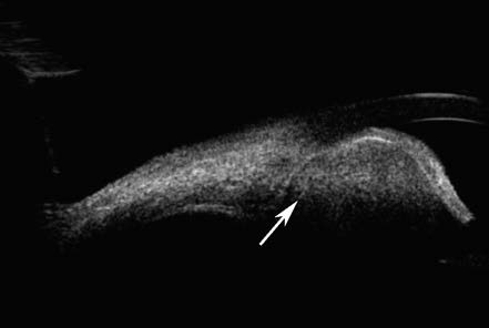 The adenoma of the non-pigmented ciliary epithelium appears as a mass with inhomogeneous medium echogenicity and clear borders (white arrow).