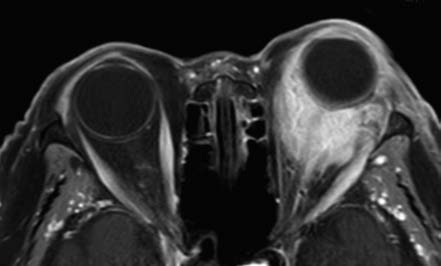 MRI typically demonstrates intermediate signal intensity on T1-weighted imaging (T1WI) and high signal intensity on T2-weighted imaging (T2WI), with marked enhancement on contrast imaging. When the tumor encases the eyeball, it may present with a mold-like appearance. Orbital lymphoma can be challenging to differentiate from benign conditions such as nonspecific orbital inflammatory disease; biopsy is often required for definitive diagnosis.
