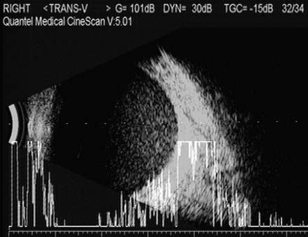 B-scan ultrasonography shows uniformly consistent, fine punctate medium-to-low echoes within the vitreous cavity.