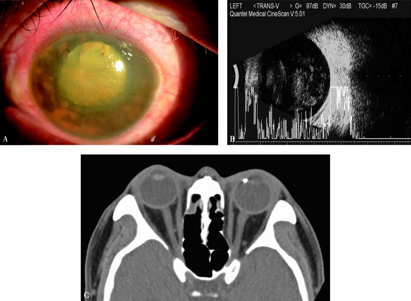 C. CT imaging shows a metallic foreign body near the nasal-side ciliary body of the left eye.