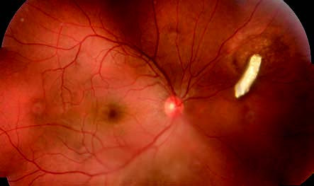 A reflective metallic foreign body can be observed on the surface of the retina, located 3 disc diameters (DD) superior-nasal to the optic disc of the right eye. The surrounding retina appears to be affected.