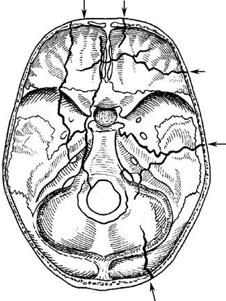 Fractures typically involve the petrous temporal bone and occipital base. Subcutaneous ecchymoses may appear over the mastoid process (Battleās sign) or in the retropharyngeal mucosa. Midline fractures may injure the glossopharyngeal, vagus, accessory, and hypoglossal nerves. Carotid artery injury may lead to carotid-cavernous fistula or epistaxis.