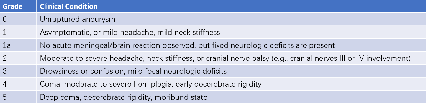 Note: For patients with severe systemic comorbidities (e.g., hypertension, diabetes, severe atherosclerosis, chronic obstructive pulmonary disease) or severe vasospasm detected on angiography, an additional grade is added.