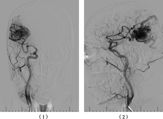 (1) Anteroposterior view showing a right parieto-occipital AVM.